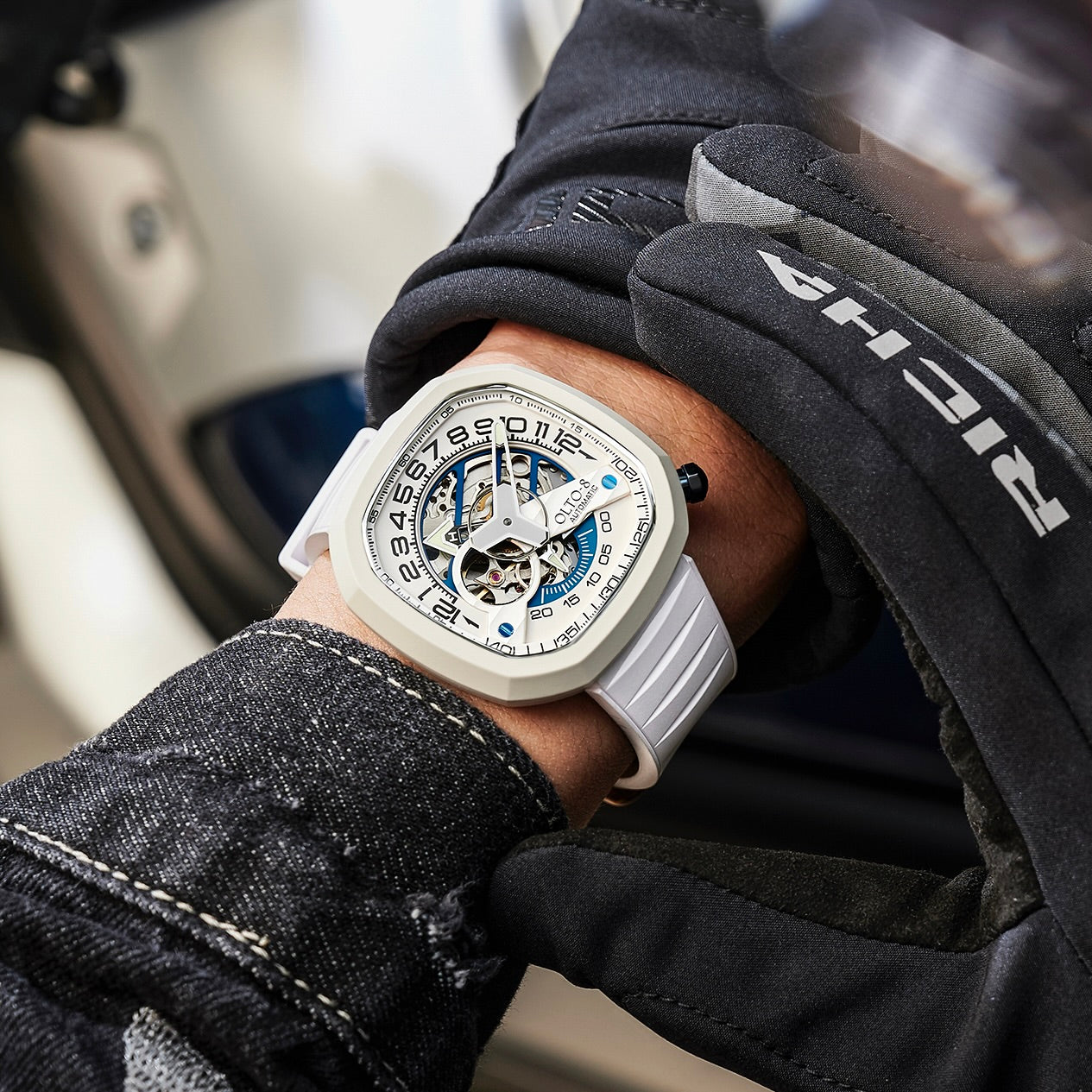 The process of telling time on the INFINITY II is unlike any other automatic watch. It employs a unique 5-layer dial layout that displays the hours (inner upper index), minutes (outer whole-circle index), and seconds (inner lower index). The watch features a multi-hand system with two hour hands arranged in a 180° position, one minute hand in a special triangle shape, and three second hands arranged in a 120° layout. These characteristics create an incredibly distinctive and attention-grabbing time display, making INFINITY II a true conversation starter!