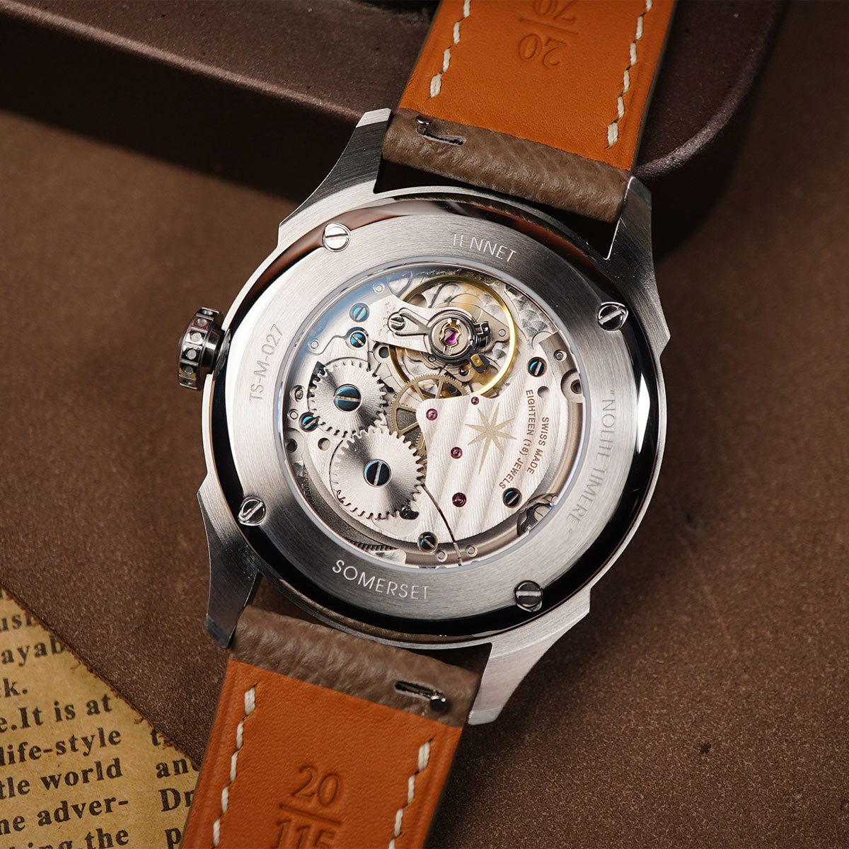 Each Somerset is driven by the venerable SW210 Swiss movement, a reliable and capable movement used in many high-end timepieces. We utilised a top grade movement, which is fully decorated, with Côtes de Genève stripes, perlage on the base plates, and heat-blued screws. The wheel bridge also features TENNET’s visual logo, an 8-pointed star, which alludes to our clarity of purpose and direction, and is also a symbol of protection, strength and energy.