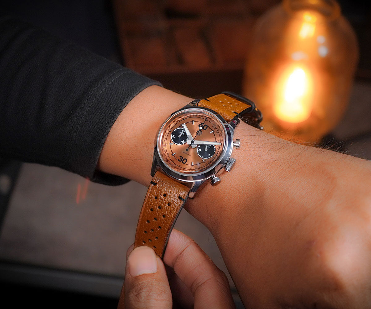 Timing and accuracy are two things that are hard to separate because each is dependent on the other. The meca-quartz chronograph chosen for this watch offers accuracy that is unmatched by most mechanical chronographs while retaining the crisp actuations that endear vintage watches to collectors. It's reliable, supremely accurate, and a joy to operate. This also makes it more affordable for many enthusiasts to own.