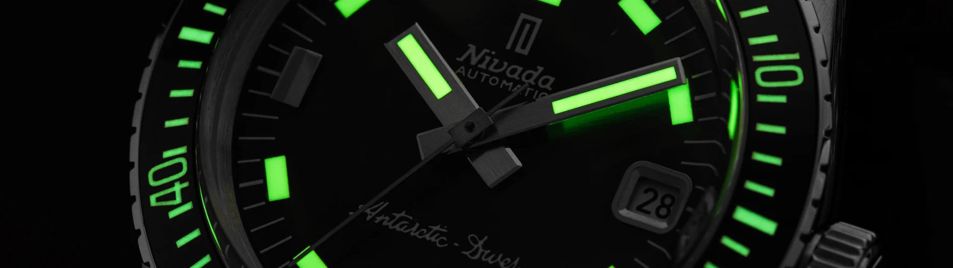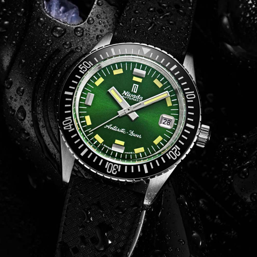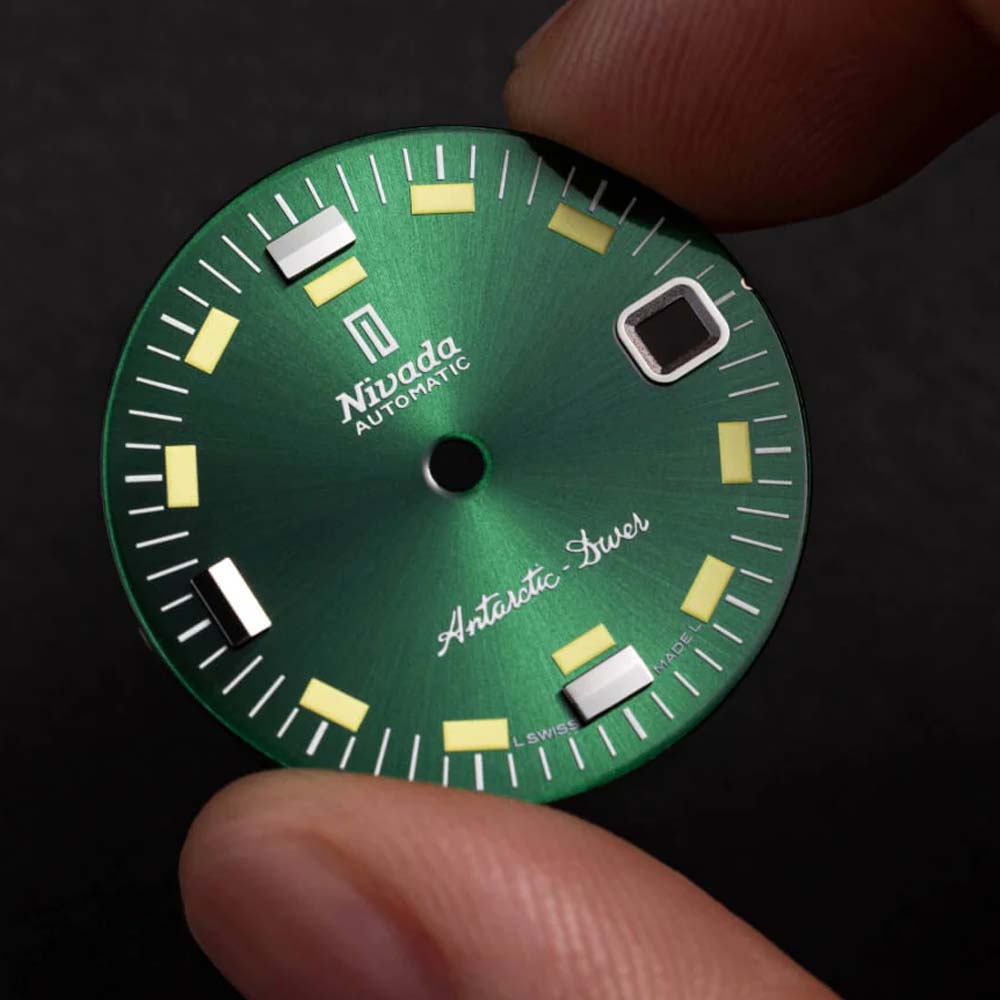The Antarctic Diver Green takes a bold step forward with a striking Green Sunray brushed dial. Rooted in the heritage of Nivada Grenchen's first dive watches, this latest iteration merges vintage elegance with modern craftsmanship.