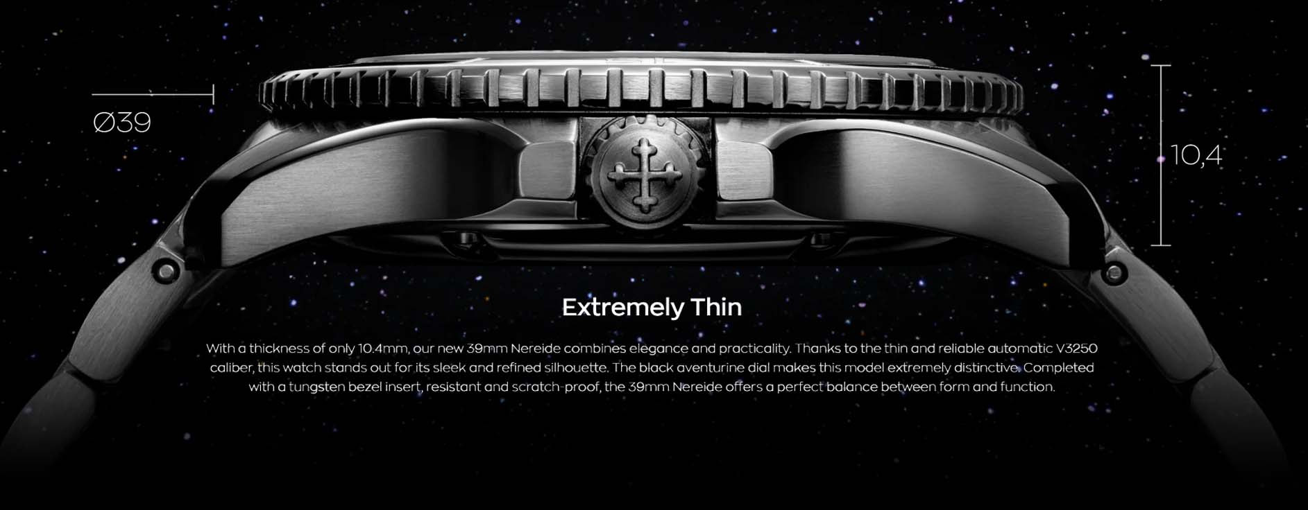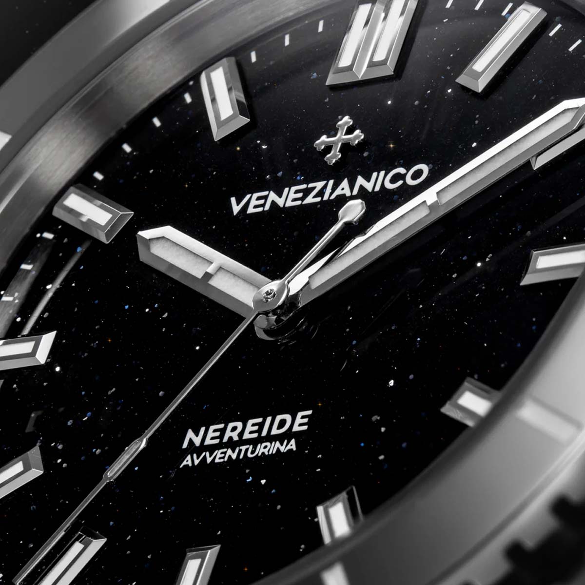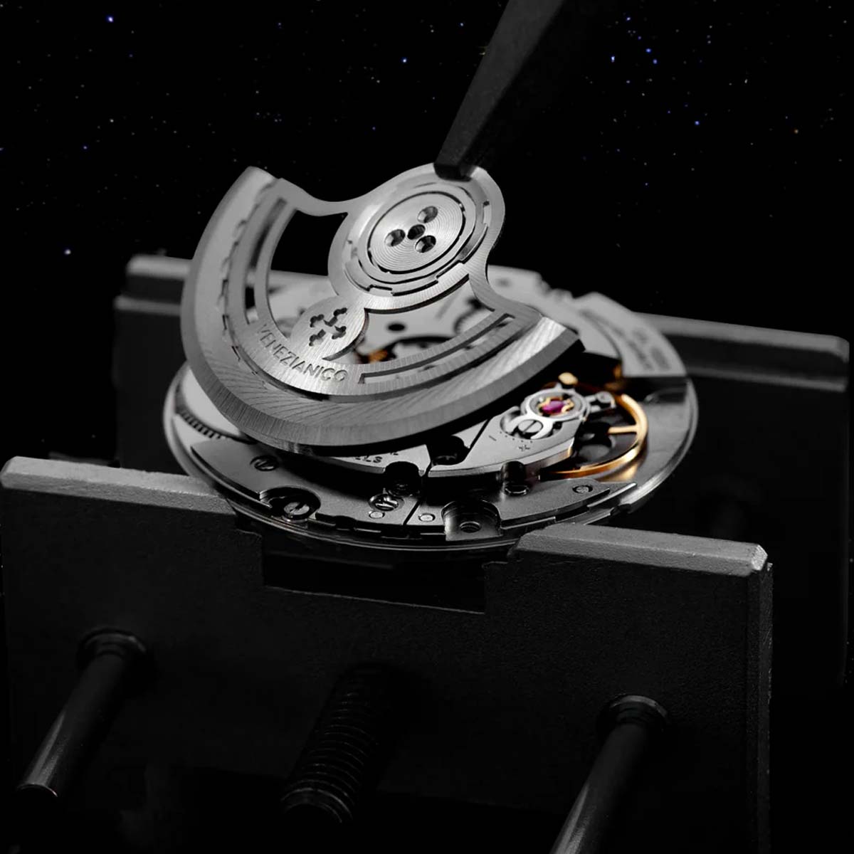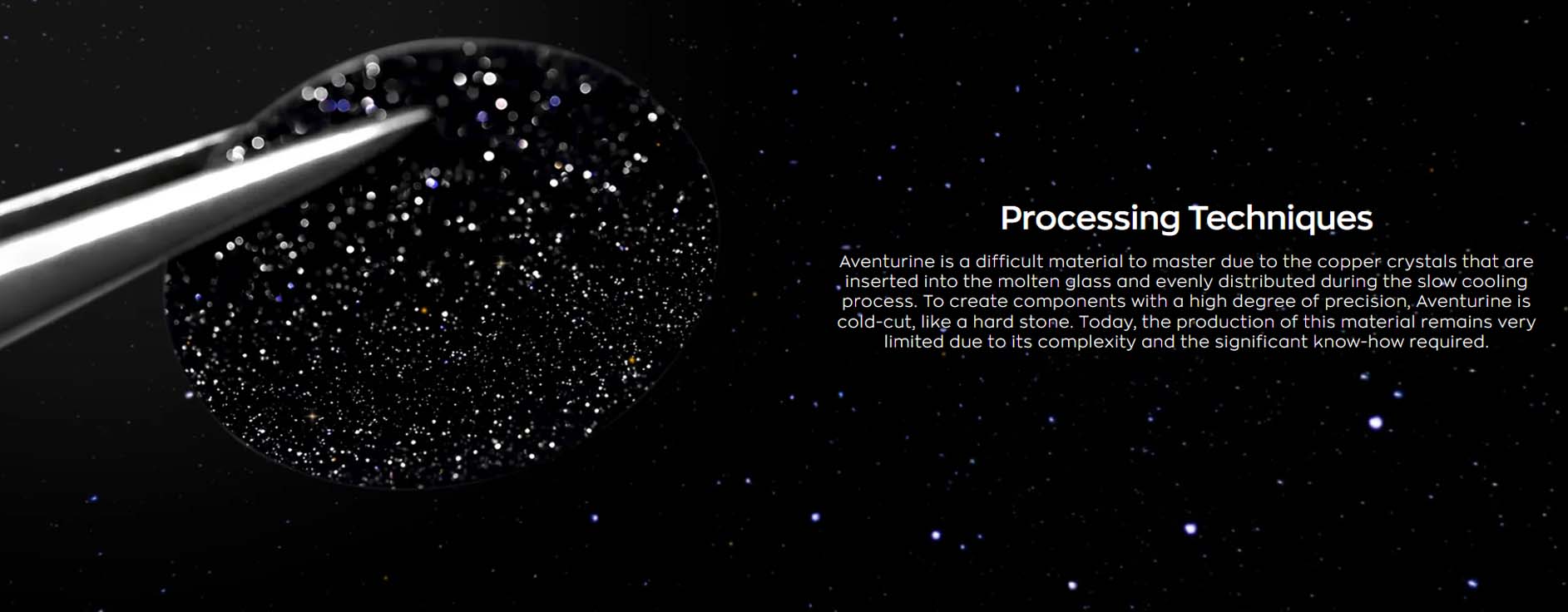 The deep black of aventurine, speckled with a constellation of tiny fragments of light, evokes the dense mystery of the stars and the darkness of the cosmos. The dial's construction is completed with ingot-shaped indices filled with Swiss Super-LumiNova® BGW9 luminescent pigment.