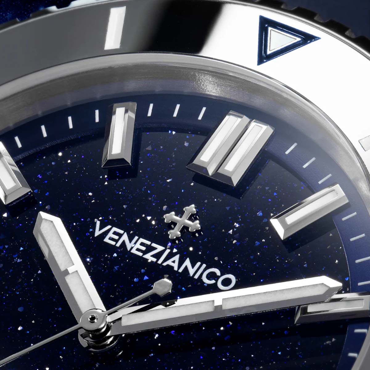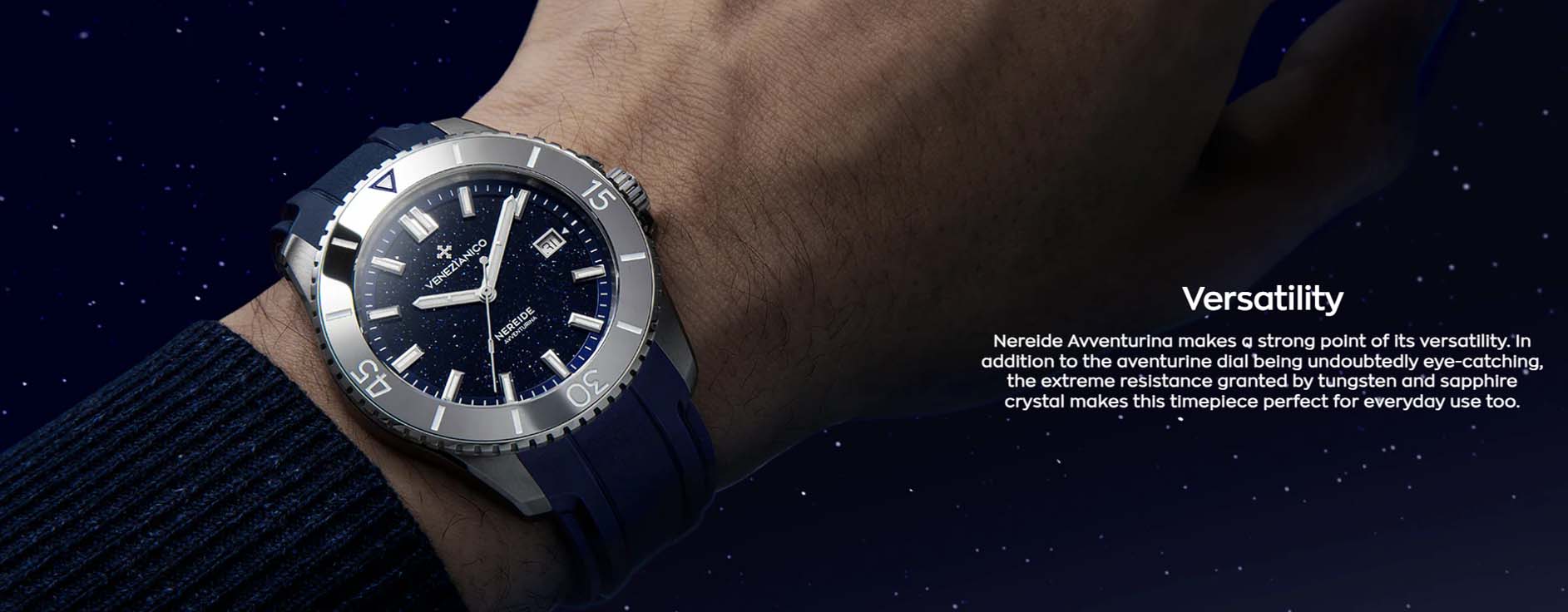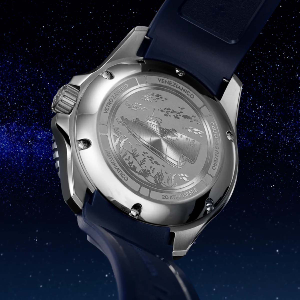 The entire Nereide collection draws its inspiration from the namesake submarine, which is depicted in the engraving at the center of the caseback. Nereide Aventurine is in fact a diving watch, water-resistant up to 200m and equipped with a rotating bezel that allows to monitor dive times.