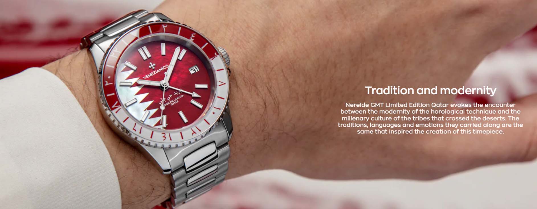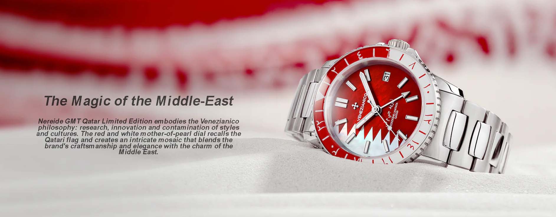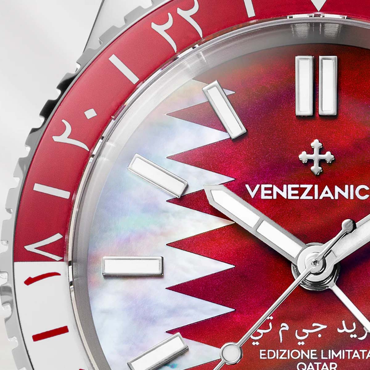 The magical glare of mother-of-pearl enhances the depth and contrast of the two colors of the Qatari flag, white and red. A duality that repeats in the bezel, made of scratch-resistant BK7 glass, which features indices with Arabic numeral to underline the inspiration for this timepiece.