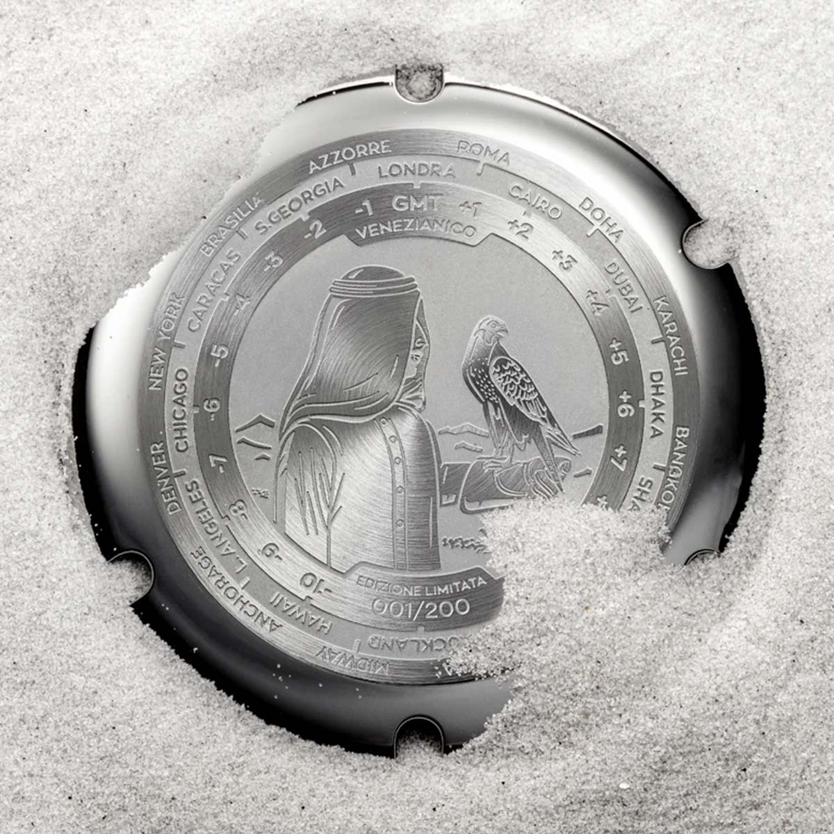 The engraving on the case back celebrates the art of falconry. The breeding of the falcon as a hunting animal is 5000 years old and was imported into Qatar by the Bedouin tribes. The falcon is now one of the national symbols of the country. The progressive serial number of each watch belonging to this Limited Edition is displayed at 6 o'clock.