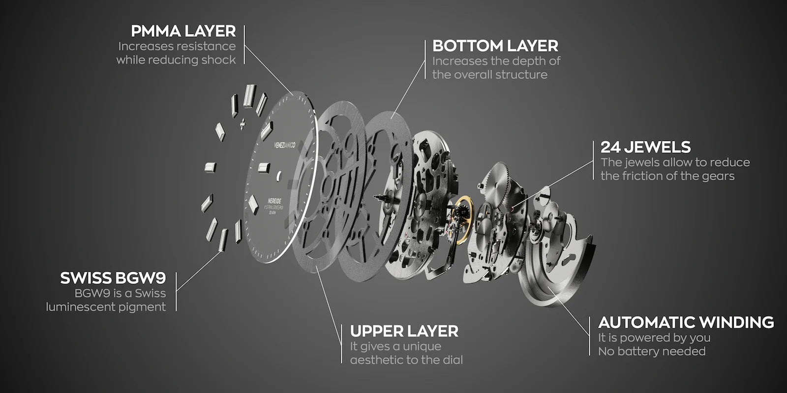 In order to reduce the thickness of the case, the dial is composed of three superimposed layers, the first of which completely replaces the spacer ring. This truly unique solution is protected by the filing of patent no. 102021000031718.